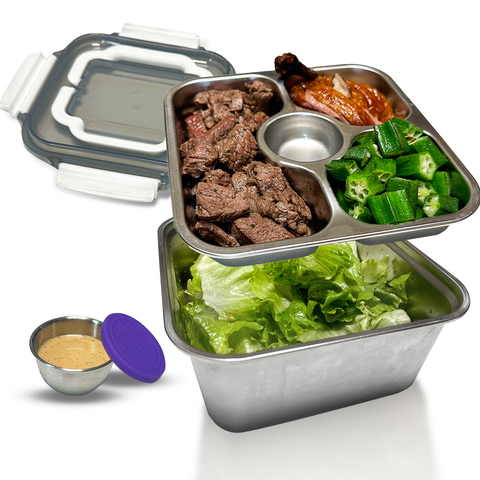 Edelstahl-Salatbehälter-Brotdose mit 3-fach Bento-Tablett und Dressing-Saucen behälter Auslaufs ic heres Design